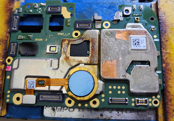 Observing the motherboard after disassembling, the corrosion is not serious. When the battery is not installed, plug in the charger for the mobile phone, and measure that the positive voltage of the battery is only 1V, which is obviously low. After replacing the charging IC, the charging current returns to normal.