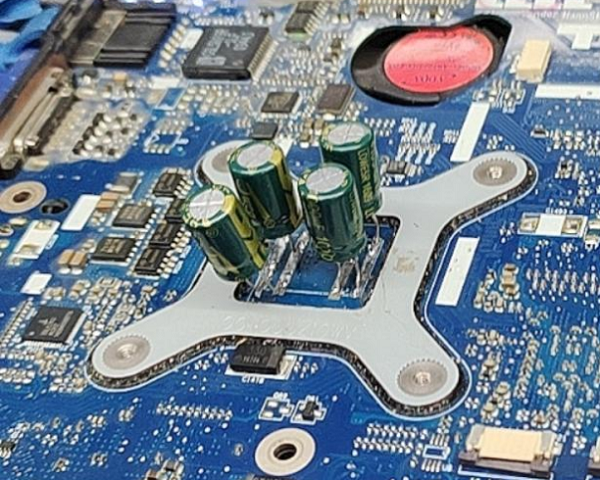 There are five 330UF capacitors in the household. I changed four 470UF capacitors. This time, I installed the screen and plugged it in for VGA test. Half an hour later, the power went off (it was a few minutes before), and the motherboard temperature was found to be a little high. As a result, it was put on my notebook, so I found a cooling bracket to test it again. At present, there is no problem for one hour, and the fault is fixed here.