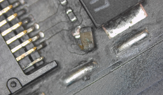 At the same time, the input terminal voltage PPBUS_HS_3V3G3HRTC_X is not available, and the resistance to ground is only 13 ohms, which may cause a short circuit in the PPBUS_G3H path. Dismantle the two fuses F7000 and F7001, and confirm that the load terminal is short-circuited. Looking at the same circuit from the point to point, it is found that the capacitor is corroded badly near the circuit corroded by water.