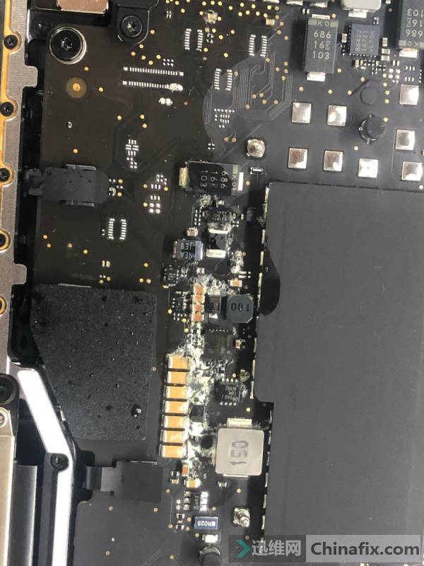 After disassembling the machine, the appearance inspection of the motherboard found that water damage and corrode in the backlight boosting part were serious.