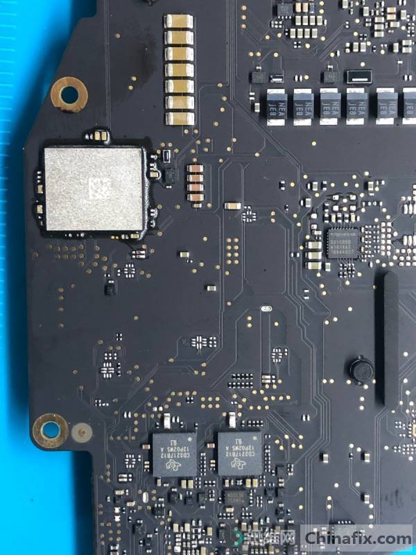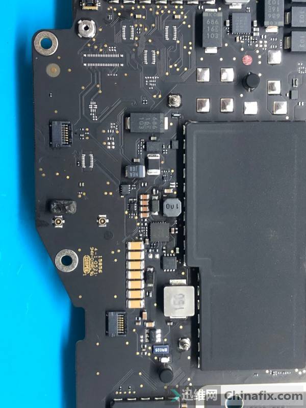 Measure the key points of the motherboard. First of all, where water damage is tested, the common point part PPBUS_AON,D impedance to ground is 300 ohms, the backlight boosting part circuit of corrode is serious, PPVOUT_LCDBKLT,1009 ohms is normal, other boosting IC UP800 parts are measured to be generally normal, and the back WiFi part, the main VCC part PP3V3_S2_WLBT_ISNS is tested to ground.