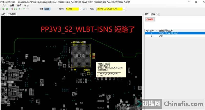 After measurement, problems were found in the back near WiFi.Short circuit appeared in the main VCC part of WiFi, and the impedance to ground was 0 ohm. Open Boardview to check the related components.