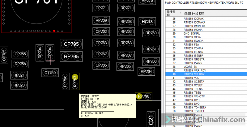 Open Boardview and check the time sequence. It is found that the reset is sent by the bridge after the CPU chip VCC is given to PG. it can be seen that 39 and 40 pin of Boardview 8859 are pulled up by 3V, and the measurement is only 0.5. It is judged that the wire is broken.