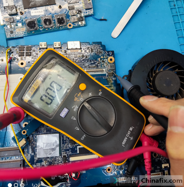 For the time being, eliminate the problems related to the graphics card and turn to the fan fault. Press the boot screen to light up, the graphics card fan does not respond, the CPU fan turns, and the positions of the two fans are reversed, but the CPU fan turns and the graphics card fan doesn’t turn, so it turns to measure the graphics card fan interface VCC, and the measurement shows that: