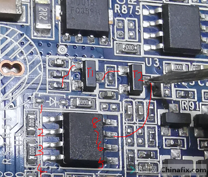 The B pole of T1 comes from R1 and R2 partial voltage, and there is no VCC at the left end of R2. The pin is divided into two channels, one of which is connected with PCI 3.3V through a 1K resistance. After testing, the resistance diode value is normal, and the other is connected with GPU. It seems that GPU pin pulls down 3.3V VCC, but diode value does not have Short circuit.Disconnect the C pole of T2, and VCC of 7 pin is normal,But not yet out of the 1V core VCC.