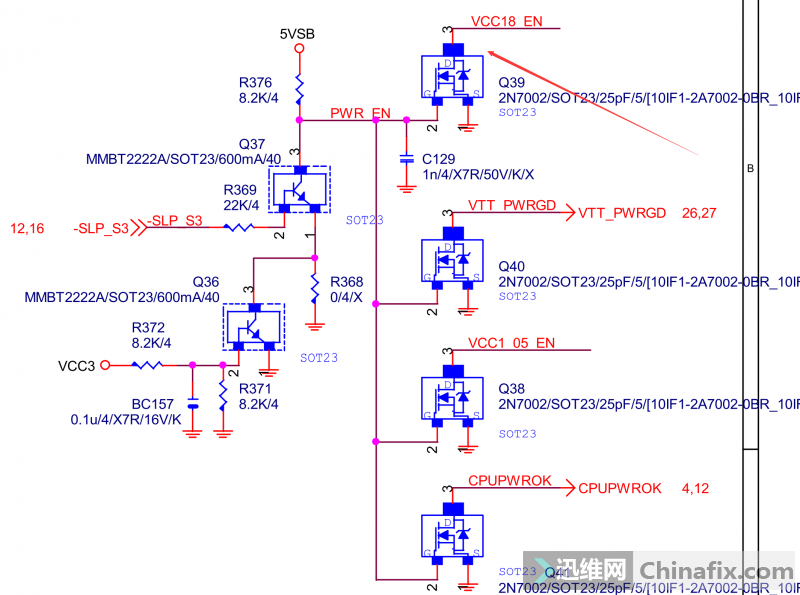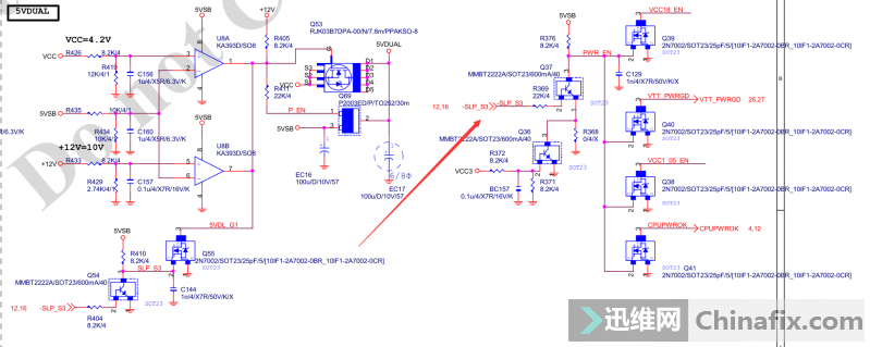 Find slp-s3 in schematic, which controls the opening of some VCC and signals, such as vcc18_IN、MTB_PWRGD、VCC1_05_1.8V of en, cpupwrok, etc. is available, indicating that slp-s3 has been successfully opened.Q393 pin, 1.8V and Q38 1.05v are normal.
