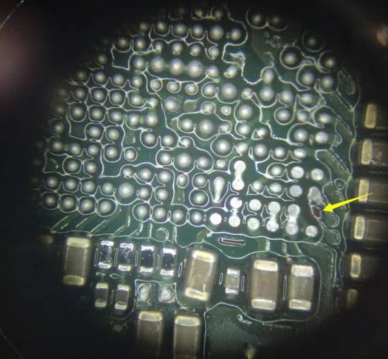 After removing the chip, it was found that the pin bit of the chip had Short bridge, which may be caused by the previous teacher Reballing. At the same time, it is found that pad break off appears in pin bit of Short bridge, which is connected to 38.4M Crystal.