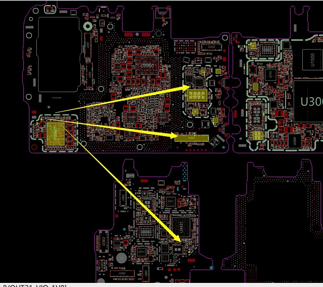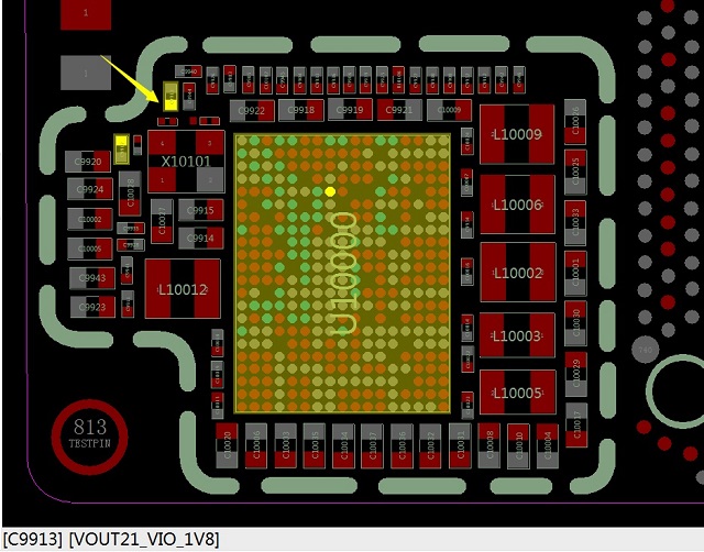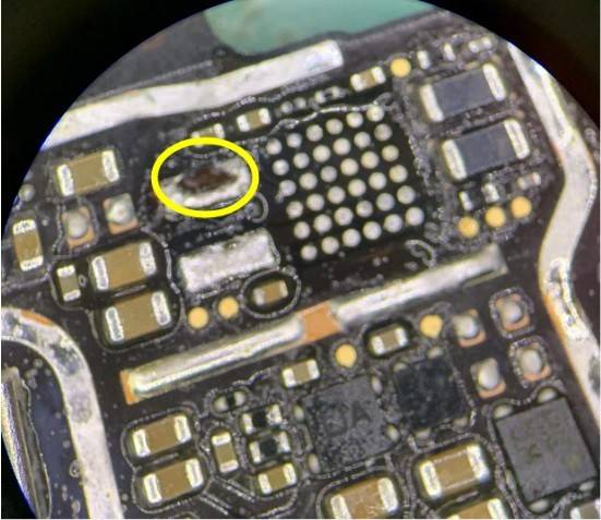 According to the alignment of the 1.8V circuit on the main board, find the corresponding pin position of the small board seat. Once again, it is found that a connected chip in the lower left corner of the small board is slightly corroded.