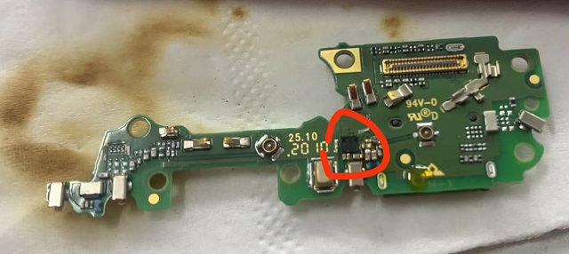 First of all, observe that the motherboard is not seriously corroded. The upper left corner of the power supply HI6421 in the lower left corner of the motherboard is slightly corroded.