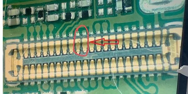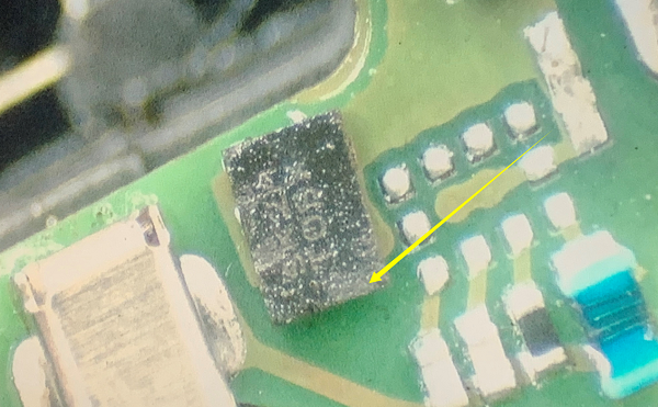 According to the 1.8V circuit on the main board, the corresponding pin bit of BTB connector was found, and a connected chip with slight corrode was found in the lower left corner of the small board.
