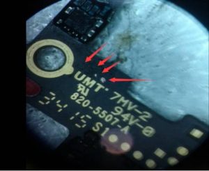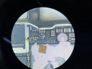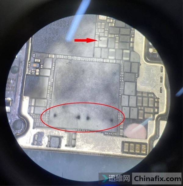 After measurement, the power chip outputs buck circuit 1.12v VCC Short circuit.The rosin smoke method method is used to find Short circuit components, and it is found that the CPU melts, that is,Short circuit is located inside the CPU. The mobile phone has never been repaired, and this kind of performance is caused by the aging of CPU, which can’t be repaired.