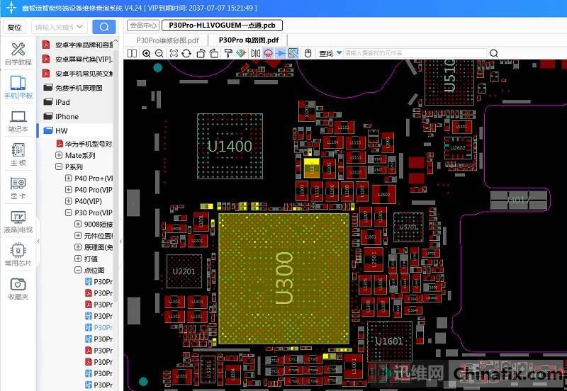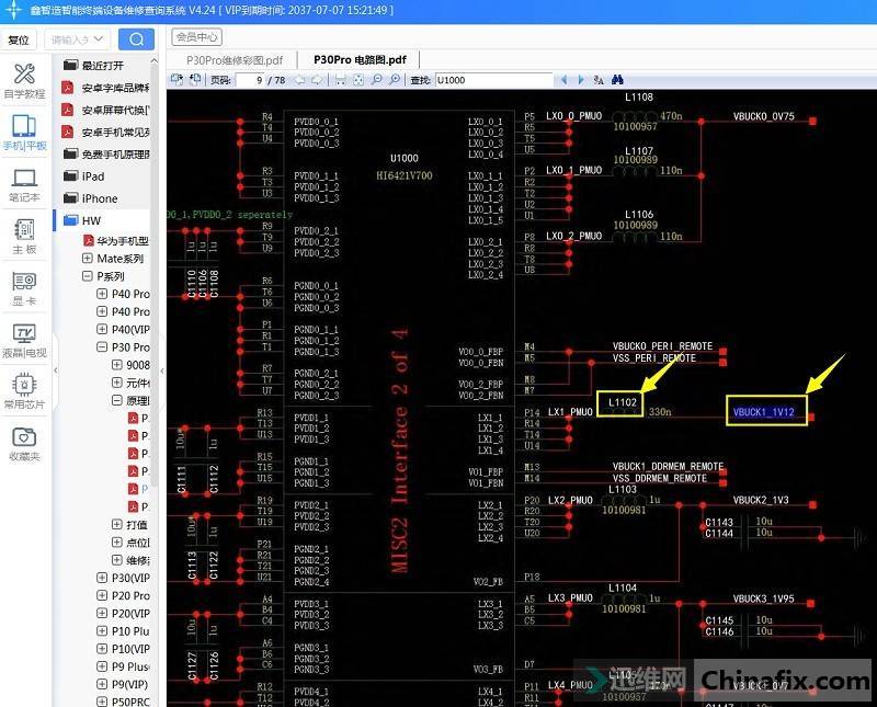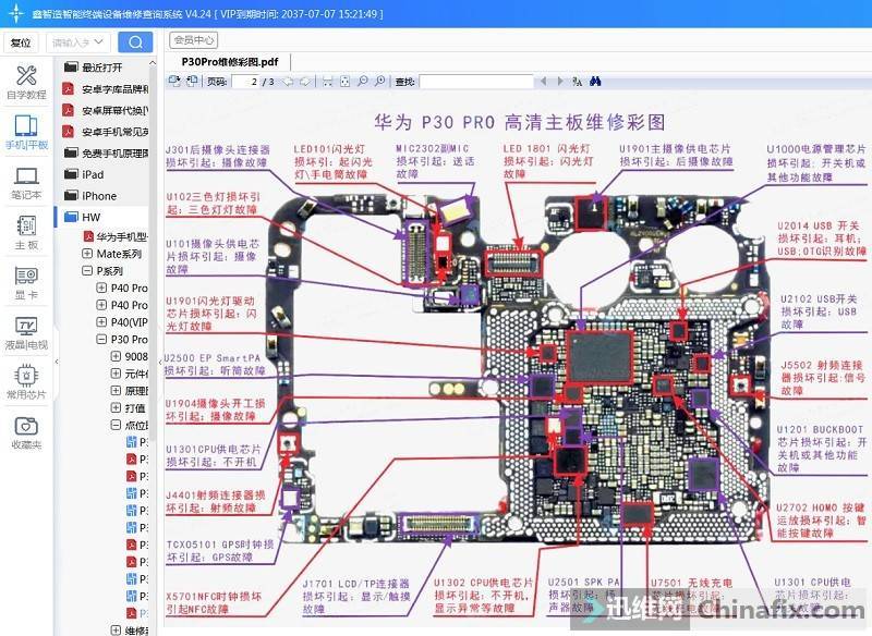 Open the Xinzhizao Soft software, find the physical labeling drawing of Huawei P30 Pro, find the power chip according to the location labeling, and measure the input and output VCC with the circuit schematic.