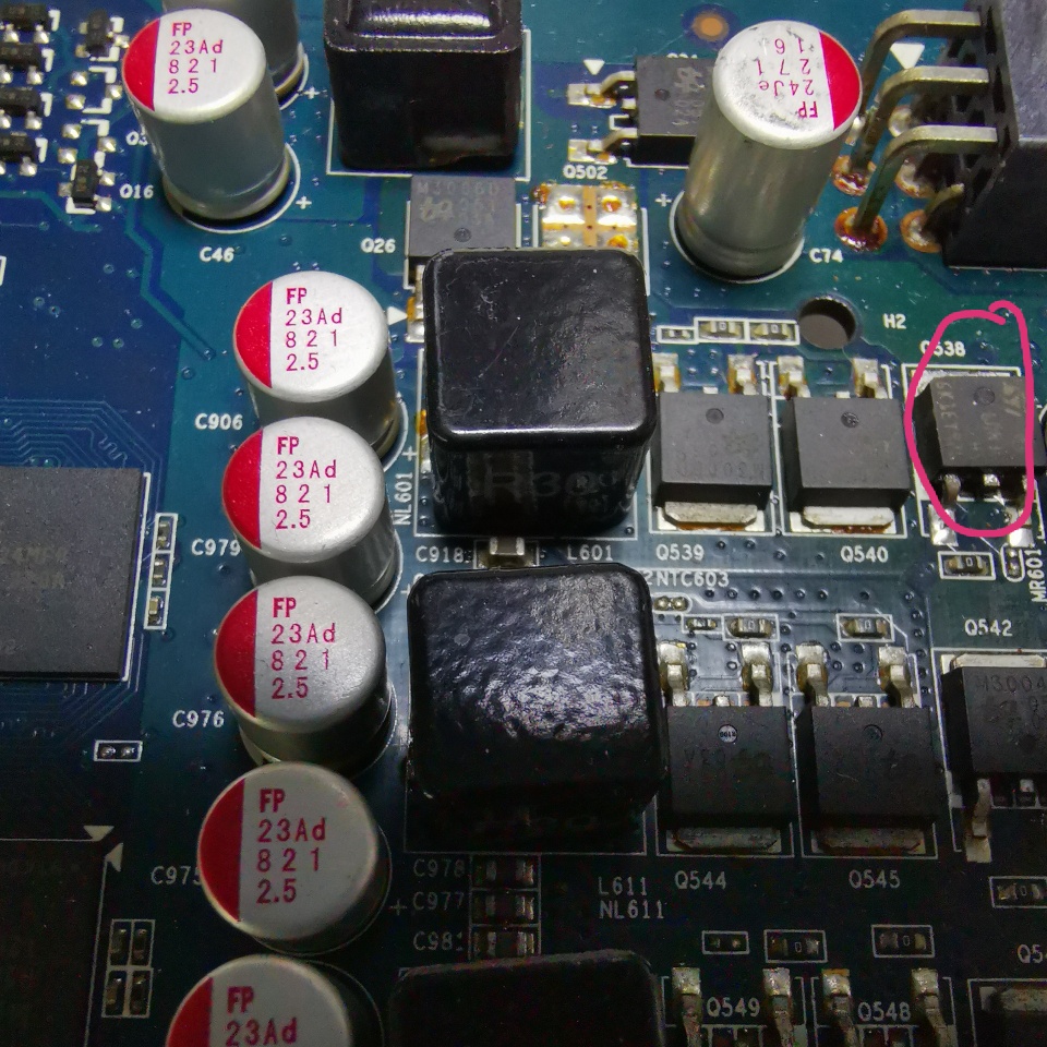 The video card can be tested, and it can be displayed or driven normally. Running doughnuts, it hasn’t been a minute before you hear the crisp “click” of the power supply Current protection. Unplug auto power off source, unplug 4P VCC of graphics card, and then power it on for testing. It can be turned on. It is preliminarily determined that the core VCC has VCC. Direct measurement of Short circuit G poles on three groups of VCC shows that there are only a dozen Euros, and Short circuit Q538 is directly replaced.The diode value 9.9k Ω is normal. All VCC are tested and the results are as follows: