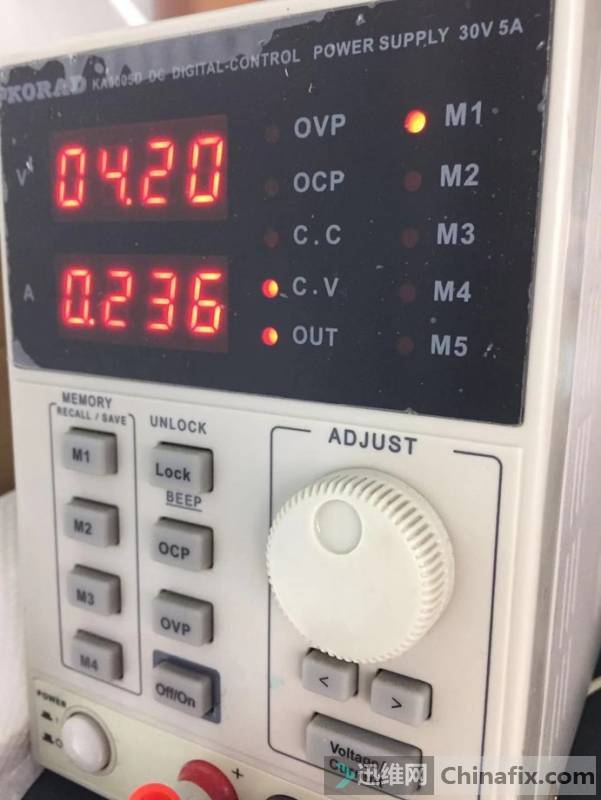Maintenance process: Previously repaired machine, customer description water damage, ultrasonic cleaning, Connect the power supply short-circuit current 236.