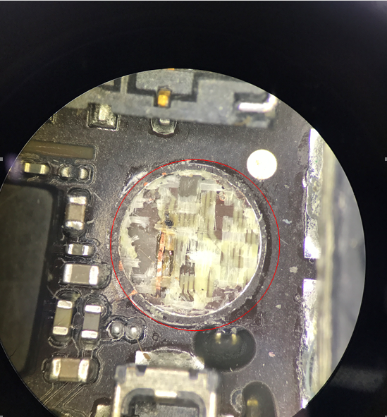 Maintenance process: Disassemble the machine, connect DC power supply to see that the startup current is normal, but the screen screen is black or frozen doesn’t respond, and the screen failure remains the same. Microscopic observation showed that Screw hole next to BTB connector was punctured and Screw hole son fell off.
