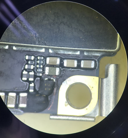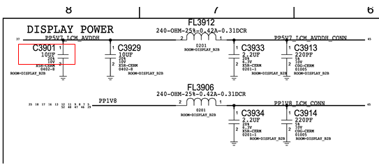 Under the microscope, it is found that there is trace of corrode in C3901 Capacitor, which is the filter Capacitor on PP5V7_LCM_AVDDH circuit.