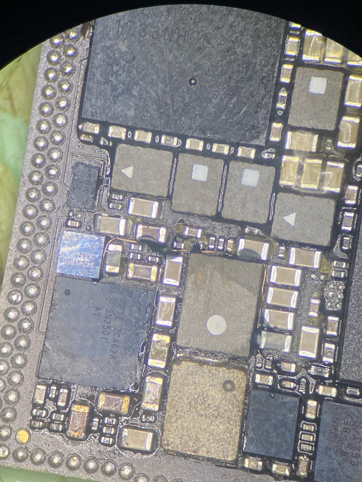 Peer repair machine iPhone X mobile phone can't be charged, measure charging management U3300 diode value, find A4 disconnected,Jump wire OK, spike.