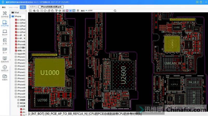 Open the Xinzhizao Soft drawing, find iPhone X Boardview, check the wiring between the upper motherboard and the lower motherboard, and find that pad break off has two signal lines. 90 _ PCIe _ AP _ to _ BB _ refclk _ n, 90 _ PCIe _ AP _ to _ BB _ refclk _ p, these two signal lines are the positive and negative of PCIE lighting cable CLK from CPU to Baseband.