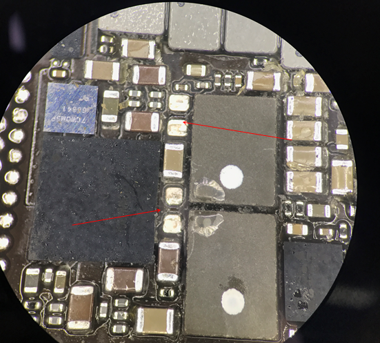 Motherboard separate, no abnormality was found under microscope. When the sealing glue around charging booster Inductor was processed, C3316 and C3391 Capacitor Inveracious Soldering fell off. Combined with the previous findings, we found that the back of the charging booster Inductor is the vibrating Inductor chip U5200, so it may be that the sealing element on the charging booster Inductor side was blown to Inveracious Soldering when the circuit on the vibrating Inductor chip U5200 side was repaired before.