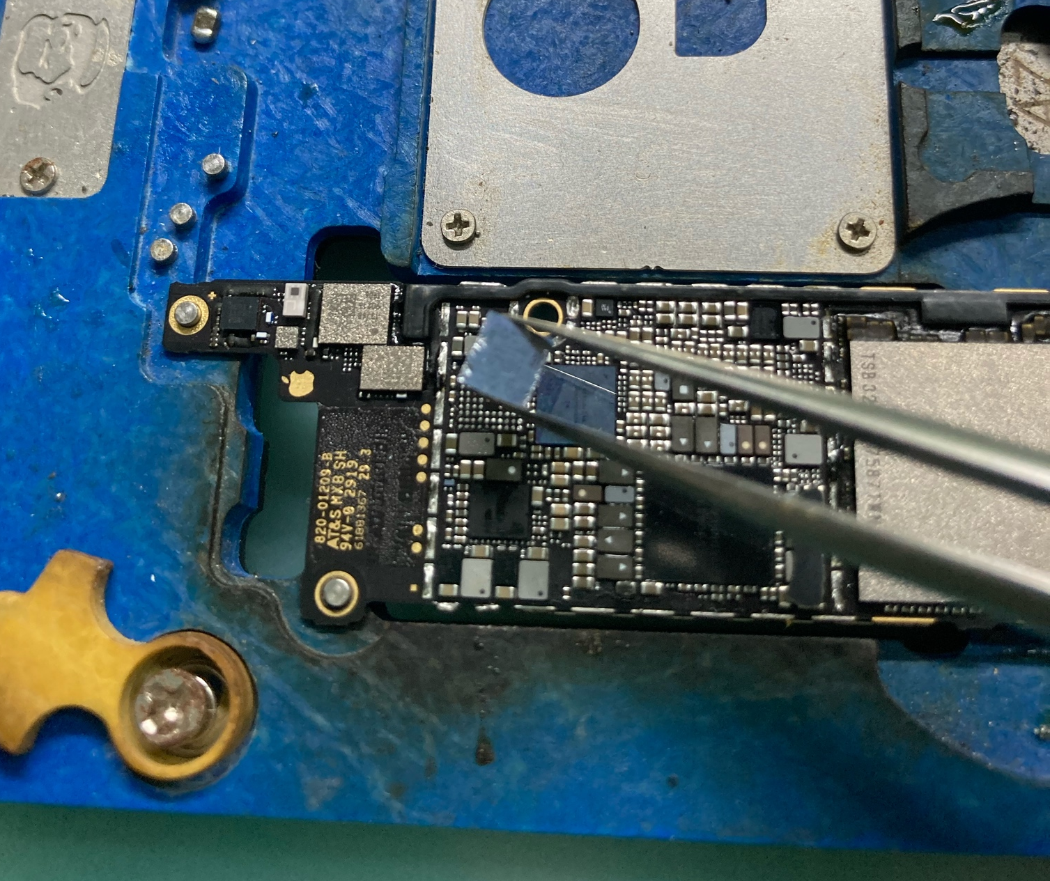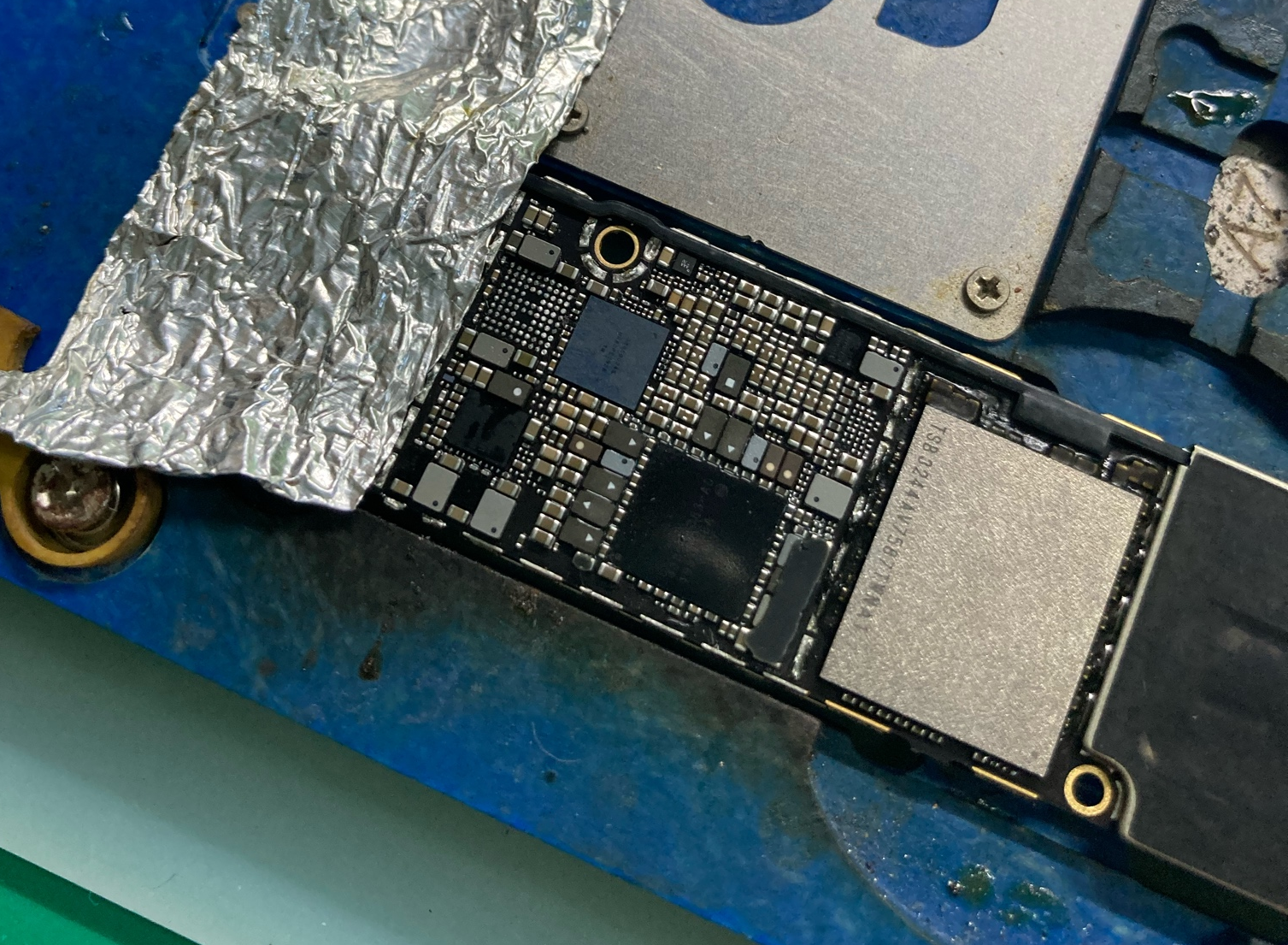 high temperature(short-circuit current) comes from the bottom of shielding cover on the back, pry it open, and according to the component drawing, it is found that Face ID driver chip short-circuit current, which is essentially an PMU.