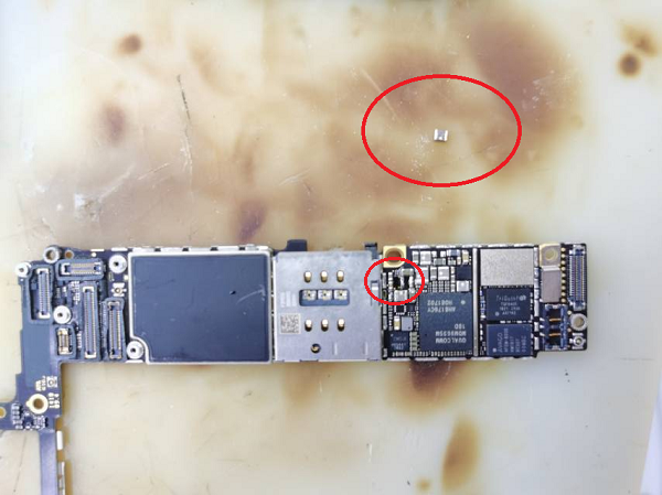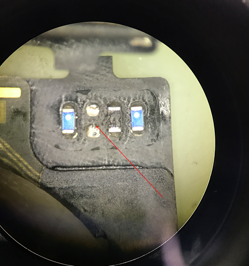Then the fault point is on the screen or earpiece FPC. It is found that the jump-off current is abnormal when connected with earpiece FPC. When earpiece FPC is removed, it is found that the sealant on resistor earpiece has burned yellow.
