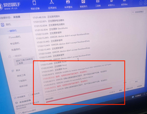 After getting the machine, continue to brush the machine for testing, and see what the error code is. The result is still that when the machine is brushed to 80%, the error is reported. When the error is reported, the progress bar fails when it goes to the baseband, indicating that there is something wrong with the baseband, and the machine has not fallen or flooded. We first suspect that it is caused by virtual welding in the middle layer, so we delaminate the motherboard, re-attach it and brush the machine for testing.
