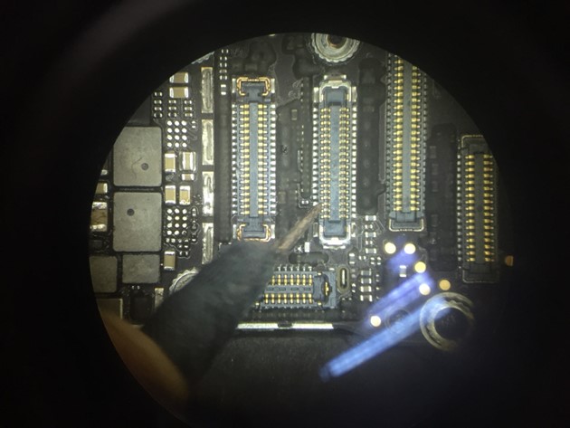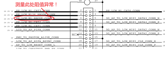 Xt9811 6 Plus is different from iPhone 6th generation. There are two backlit VCC, and one of them is abnormal, so it will look like the above picture. Remove the motherboard and measure Measuring diode value on the display BTB connector. When PP_LCM_BL_ANODE_CONN (backlit VCC)diode value is measured, it is 246 lower.