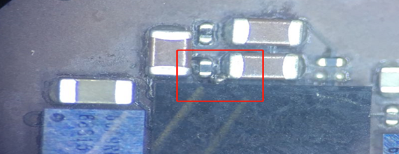 After processing the PAD and switch 60mA, the current of DFU is normal, but it is not connected to the machine when the lighting cable is inserted. When measuring the charging connector seat, pp5v0 is found_USB to the ground, observe the shielding cover above the Baseband power supply has traces of welding.After removal, it was found that there was a small tin bead between c1470 and c1740. After removal,Diode value is normal was measured and lighting cable was inserted into it, and it was on-line normally.