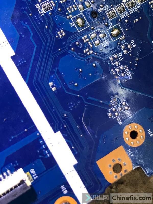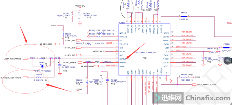 Graphics card VCC high temperature, first exclude the next level large current, because the power is not Current protection, it is not large current.Then the ground Measuring diode value is found to be hundreds of times, so it should not be caused by the graphics card Short circuit. It is considered that the PWM of the graphics card VCC is not under control, and whether the origin of the PWM chip EN of the graphics card VCC is in an uncontrolled high level.