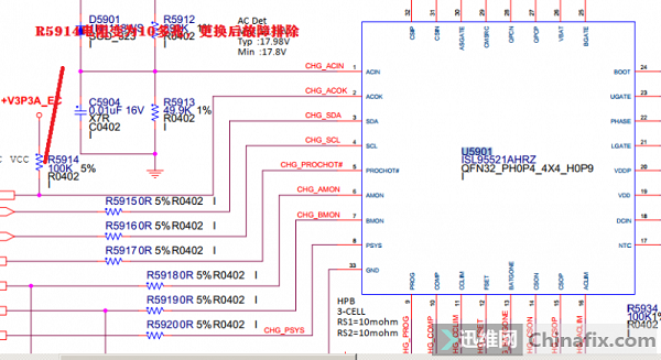 The charge and discharge circuit isl95521 was tested. Under the condition of external Connect the power supply source adapter, it was found that Pin1 AcIn 2.1V was normal (pin potential was 0V without adapter), but Pin2 pin ac0k power supply was 0V (the pin point should be 3.2V or so when connected with adapter) and external r5914 was detected. One end of the resistance was connected with + v3p33a_EC (3.3V), the other end is connected with isl92221 Pin2 acok terminal.It is found that the resistance has been increased to more than 10 megabytes. After replacement, the charging fault has been eliminated and the machine has been repaired.