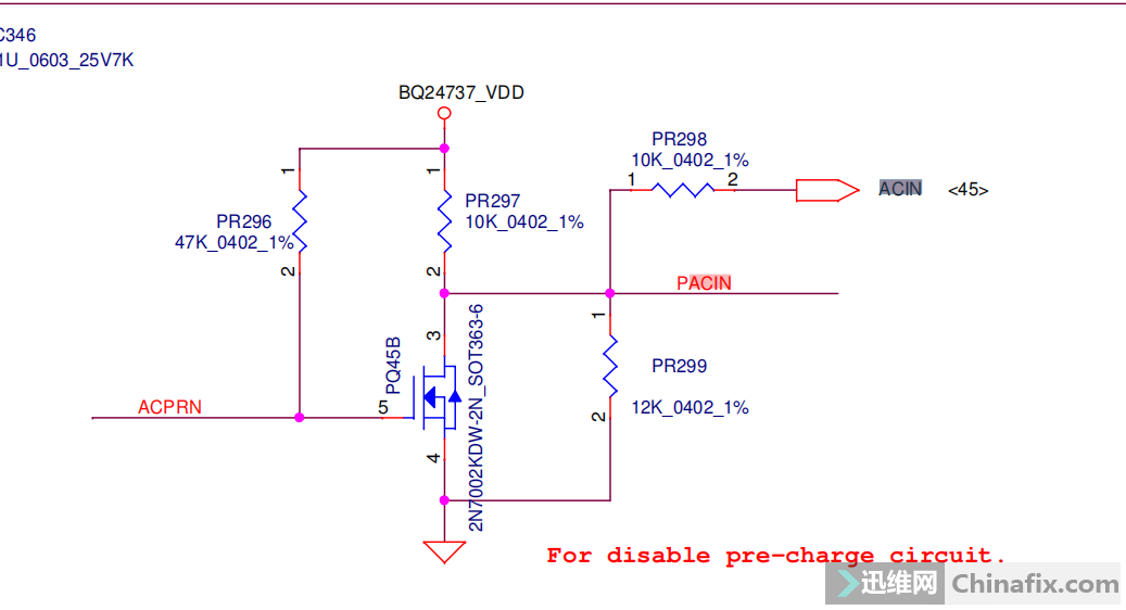 Aci VCC is divided by PR297 and PR299, pulled up by PR298 and controlled by PQ45b. The measured BQ24737 _ VD VCC V is normal, the G pole ACPRN 0 V of PQ45b is normal, and the divided voltage produces Pacin3.3V.