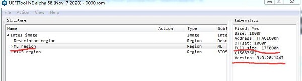 UEFITool tool opens the 0000.rom file and finds that the ME firmware version is 9.0.20.1447, the ME firmware size is 17F000h, and the ME firmware initial offset address is 1000h.