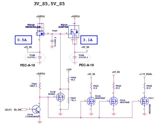 It is found that the voltage of +3V_S5 is pulled down by 1.7V. Check the voltage of pin 2 and pin 3 of PQ142 on the drawing, and the resistance and voltage of PR432 and PR437 are normal, so it is judged that the problem lies in PQ138.