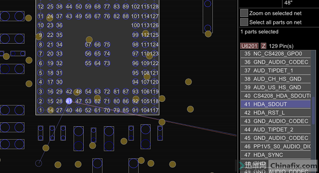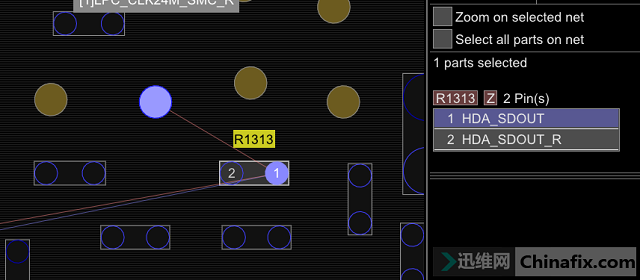 Look at the drawings and find these five signal lines in the circle between the sound card and the CPU. According to the measurement, only HDA_SDOUT is connected to the ground diode value OverLoad, that is, this connection is disconnected. Look at the point R1313 1 pin to the ground Diode value is normal.