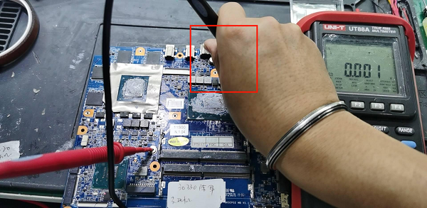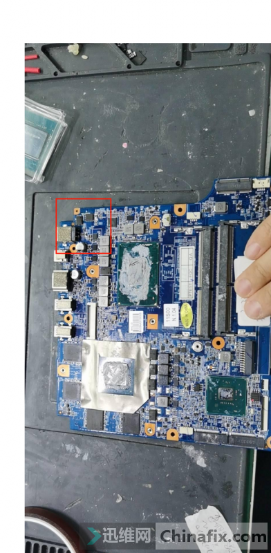 Location of DC charging port and common point Figure 1 The single board is not in a hurry to power on first. Check whether the resistance values of the major inductors on the motherboard are normal. After a dozen values, it is found that the common point is big and short, and the resistance value is 0000. First, check whether the MOS tubes of CPU and graphics card are broken down. If there are no tubes that are obviously broken down, add a voltage of 0.8V to the common point first. As a result, it is found that the core of the graphics card is hot, which is not necessarily the core hanging, but also the MOS damage.