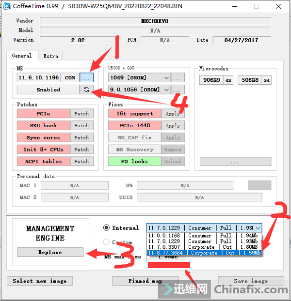 Click the three points after me to open the me configuration option. Select the me version as corporate (note that the me size should not exceed memaxsize), then click Replace. Finally, click the refresh icon at arrow 4 to disable me (after clicking, it will be displayed as disabled).