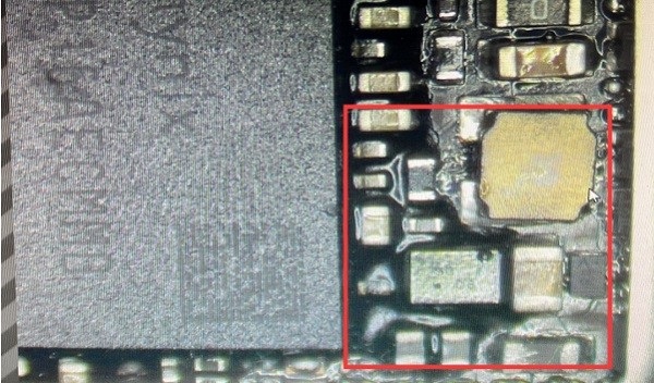 Disassemble the shield and find that there is corrosion above the chip. There is also some corrosion when the inductor foot is removed. This is the boost inductor of the display input, so replace it directly.