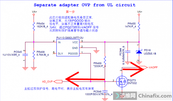 In the first step, the AD_OVP signal is output through PU113, which is low level, so PQ273 can’t be turned on, so the -VAOFF signal is low level and directly applied to the third pin of PQ266A.