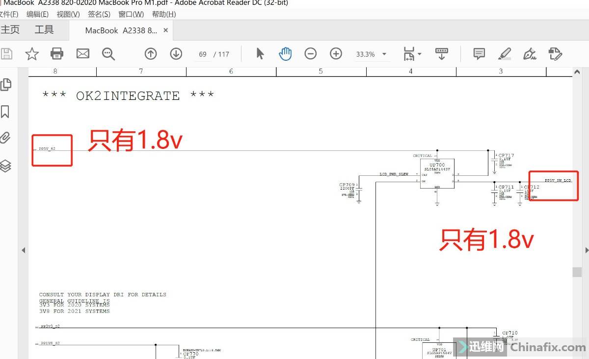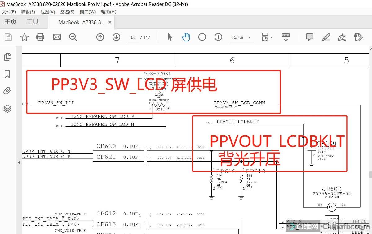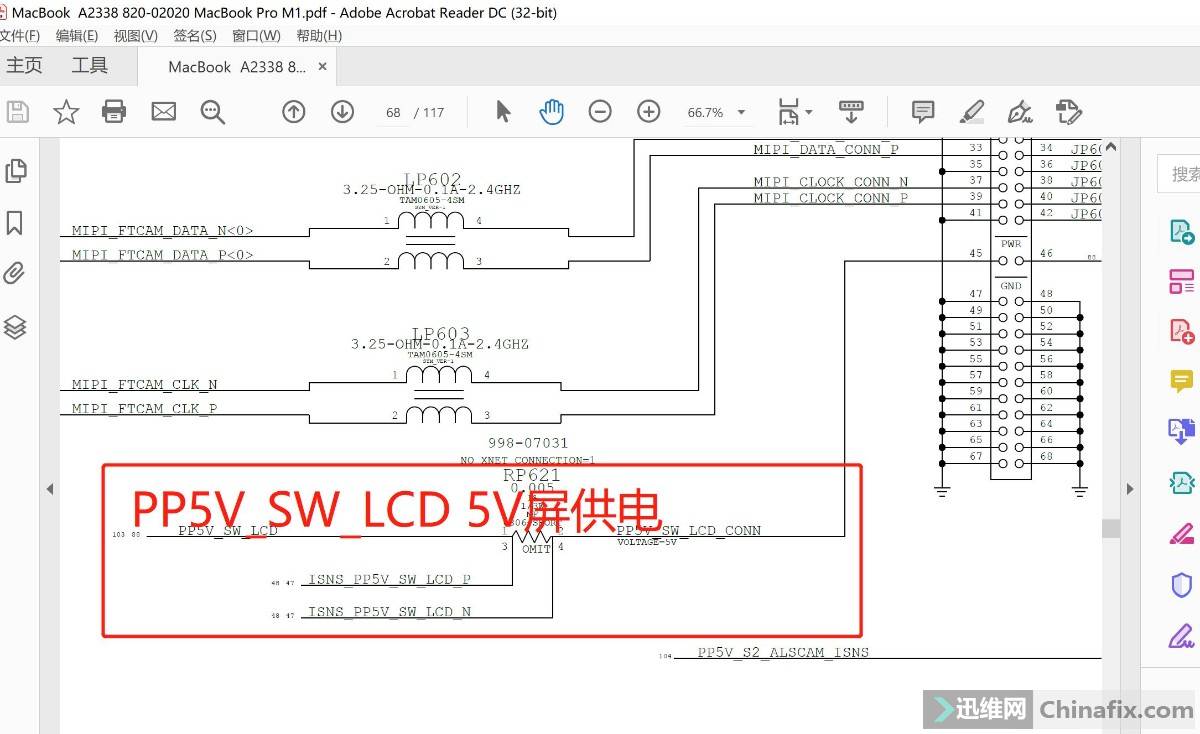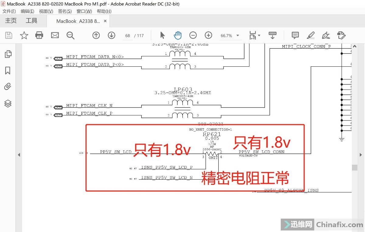 The probability that the screen VCC of PP5V_SW_LCD_CONN is only 1.8v is relatively high, so it should be traced and repaired first. Open the drawing, inquire from the source and pass PR621, the test resistance is normal, and the other end is only 1.8v