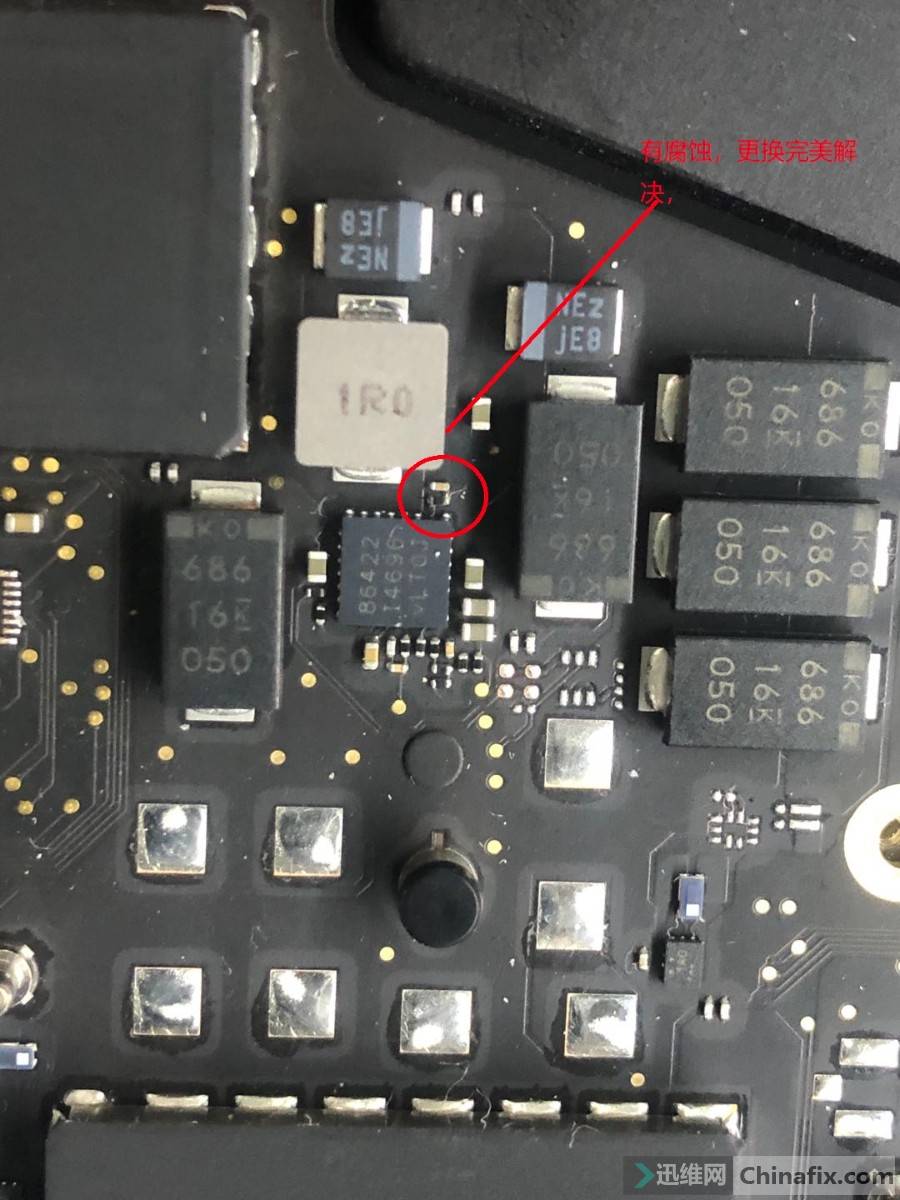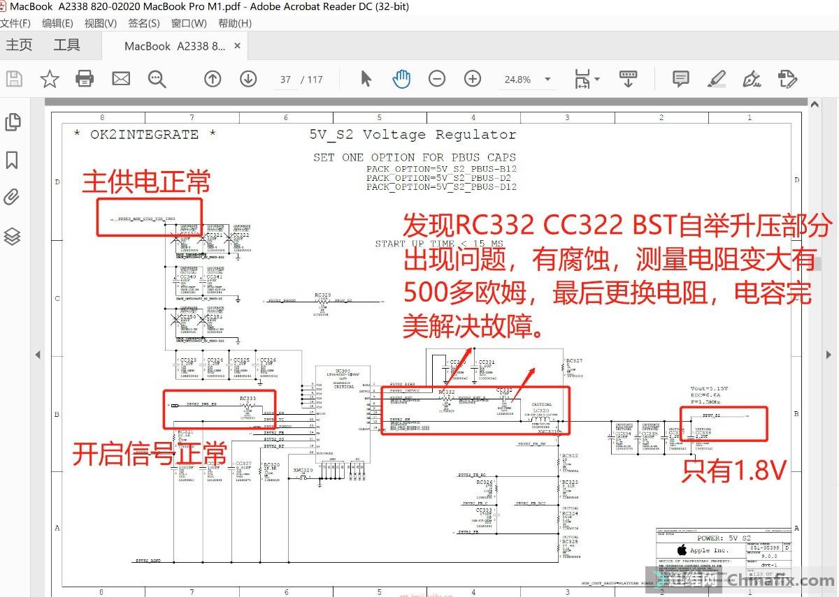 Tracing the source of PP5V_S2, UC300 measured the working conditions of the VCC IC, the main VCC and VCC were normal, and some problems of BST bootstrap boost were found. RC332 CC332 had corrode, and the measured resistance was more than 500 ohms. After replacement, the startup was normal.