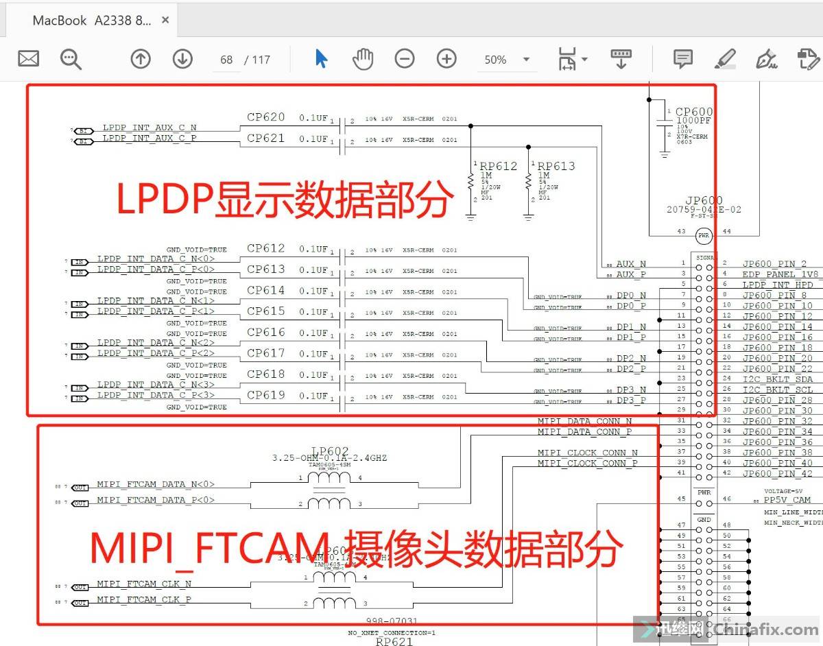 Remove the motherboard, and visually check that the motherboard is relatively clean. Measure the key points of the main board, starting with the display interface JP600. Because of the dark screen of the machine, the LPDP display data part and MIPI_FTCAM Camera data part can be skipped directly for the time being, and no measurement is needed.