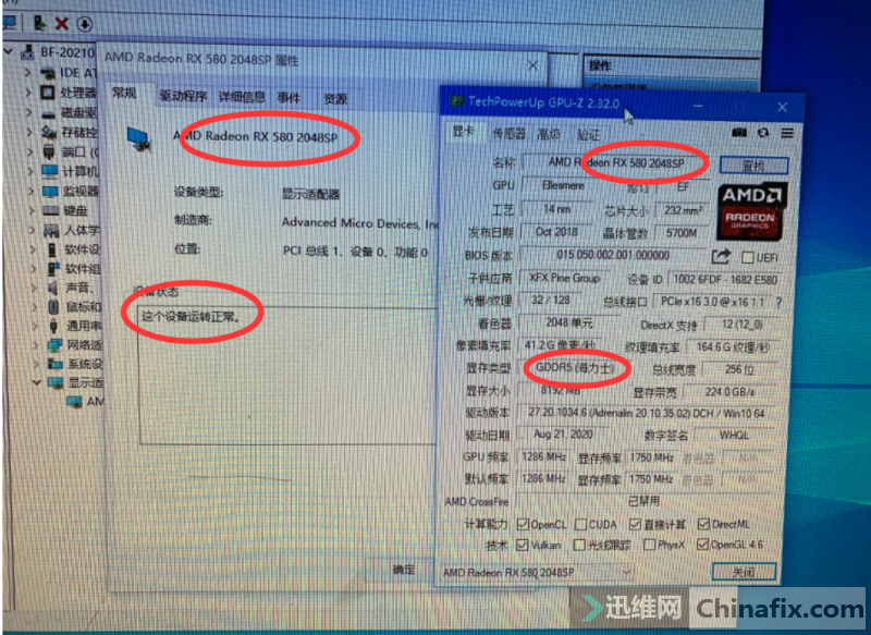 Xunjing RX 580 8GB wild wolf graphics card mining flower screen computing power,Find the cause of the fault and replace the do particle. The repairi over.